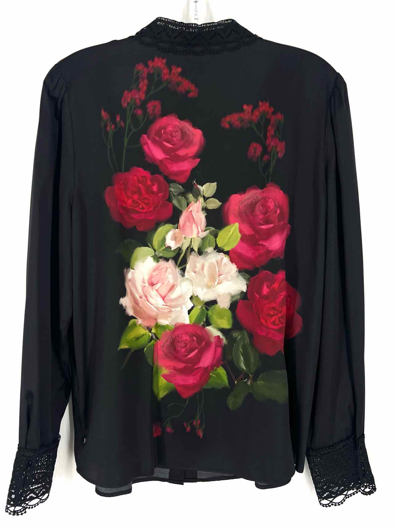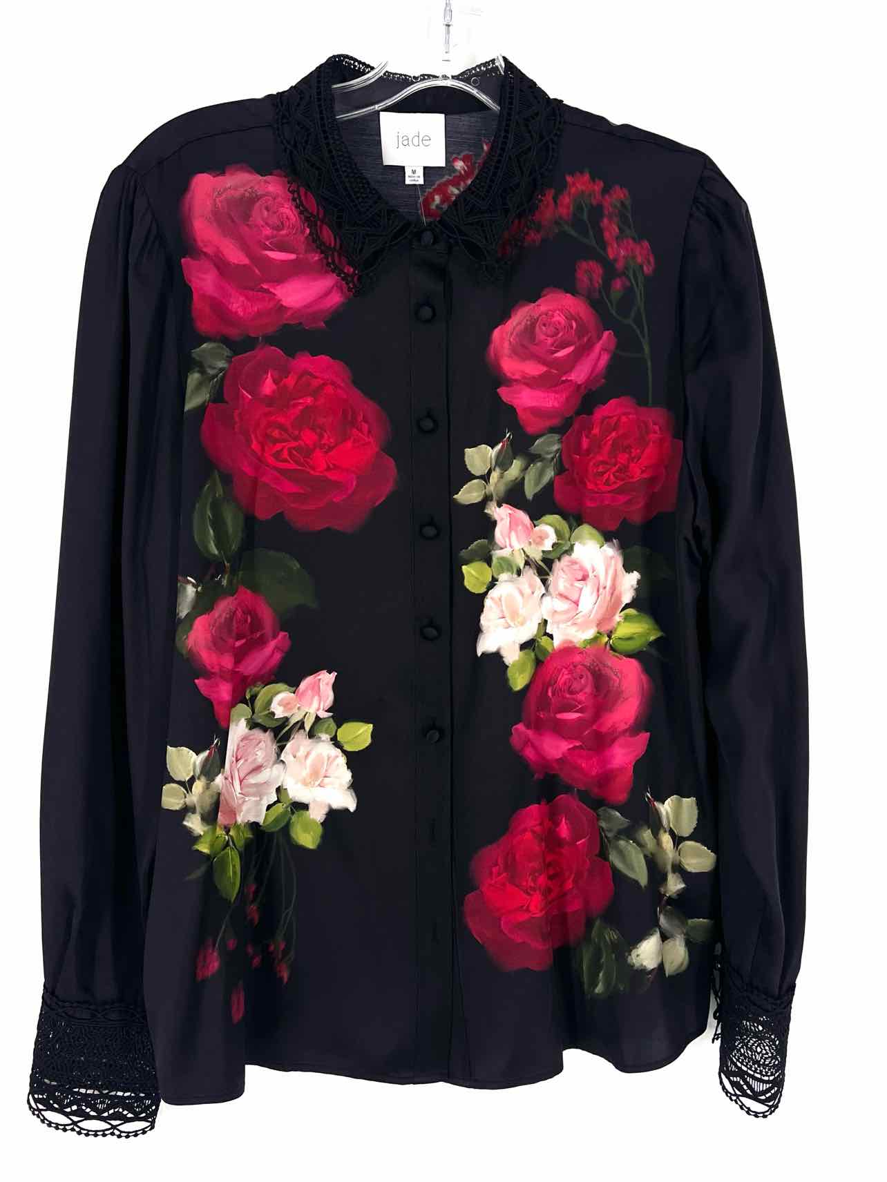 Jade Size M Bk/Rd/Gr Floral Crocheted Trim Designer Blouse