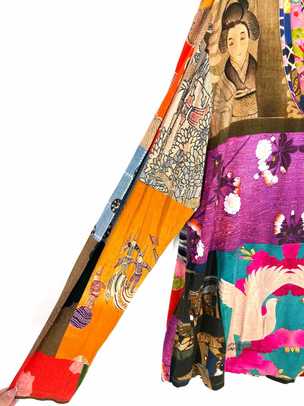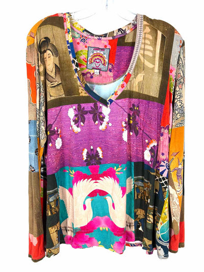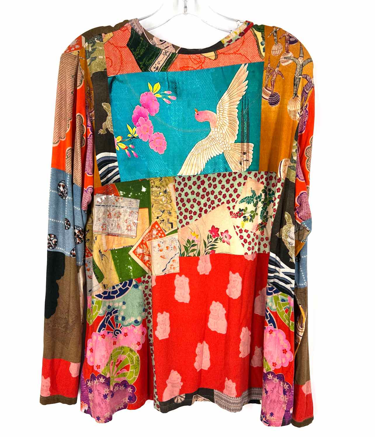 Johnny Was Size L Brown/Multi Multi-Print Blocked Designer Top-Long Sleeve