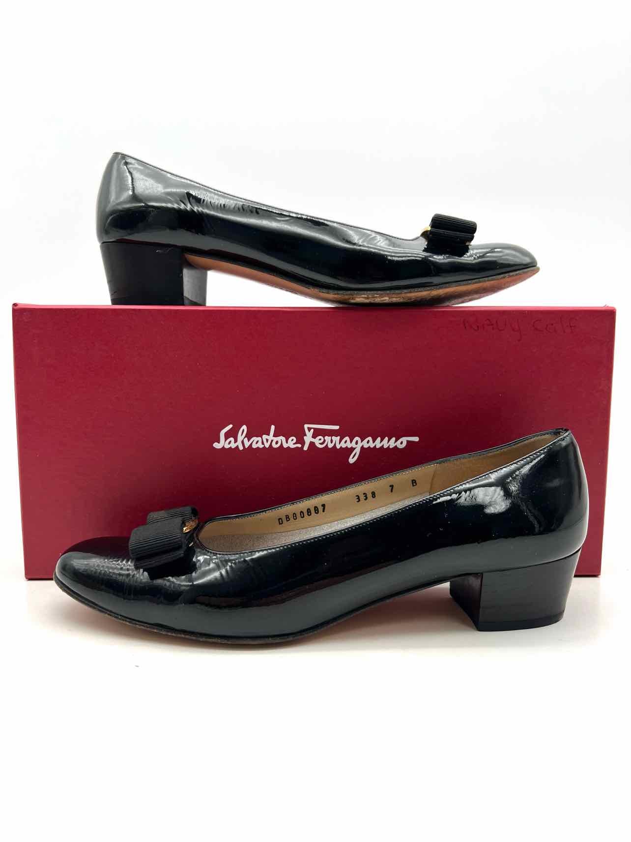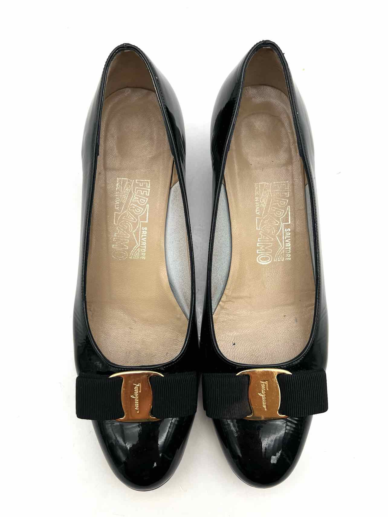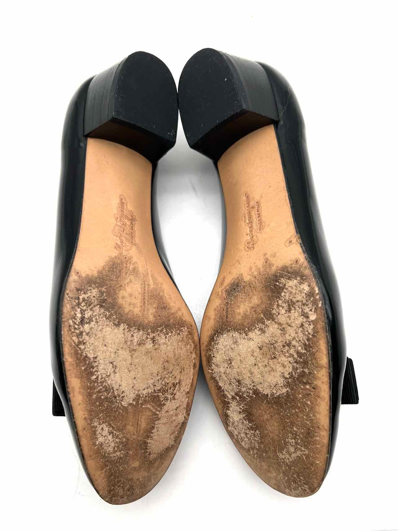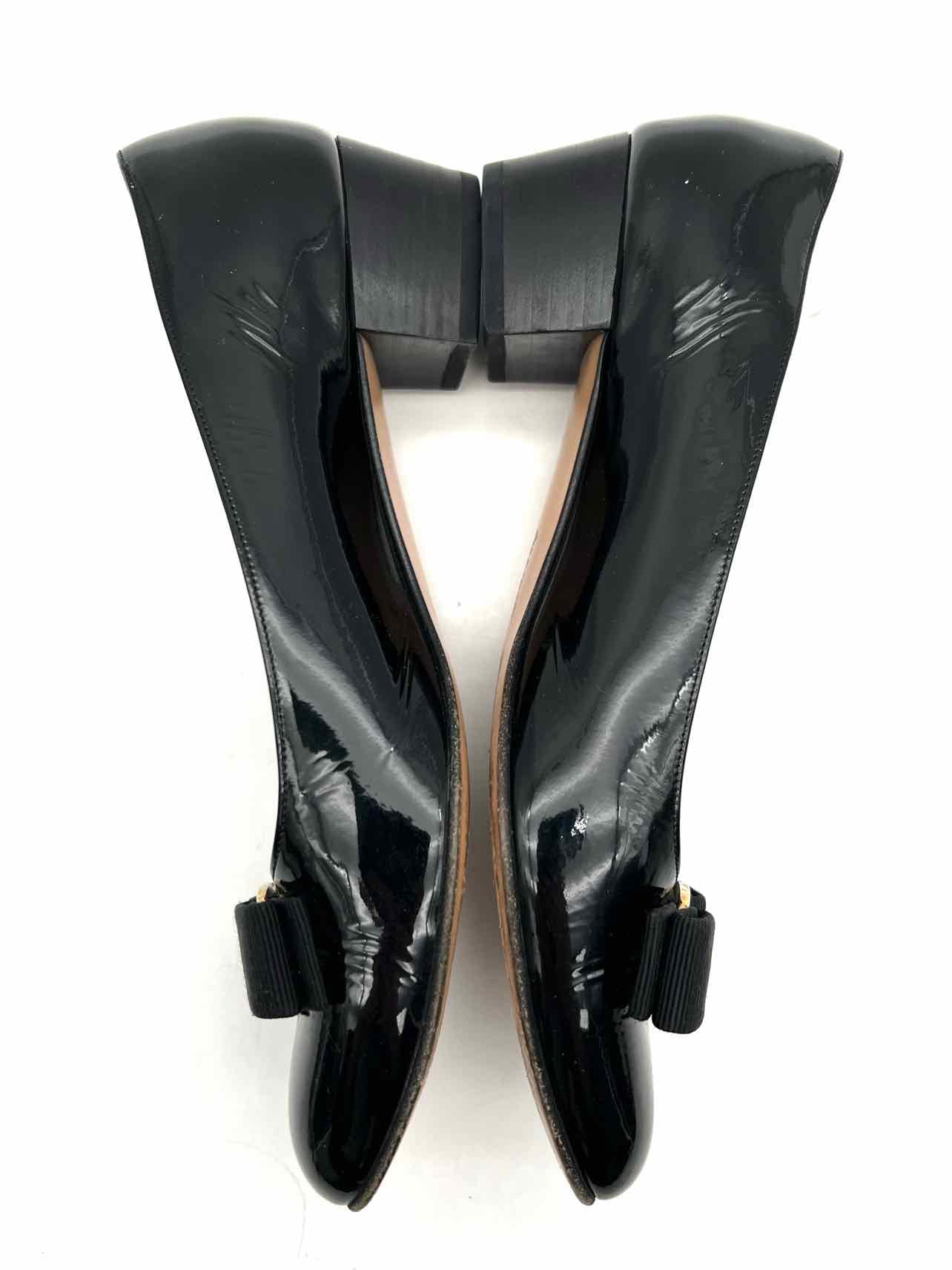 Salvatore Ferragamo Size 7.5 Black Bow(s) Patent Leather Shoes Heels