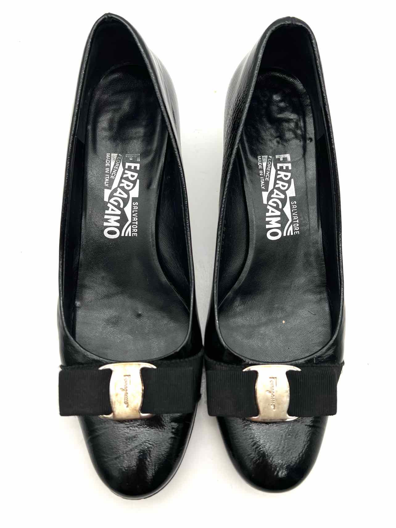 Salvatore Ferragamo Size 7 Black Bow(s) Patent Shoes Heels