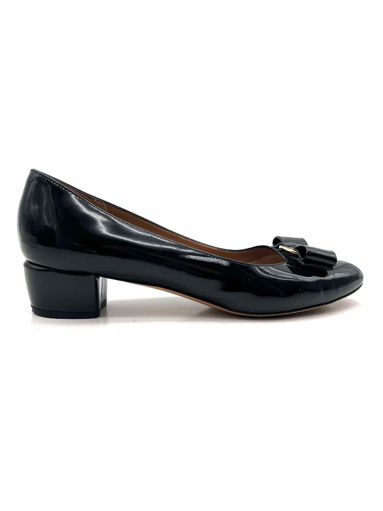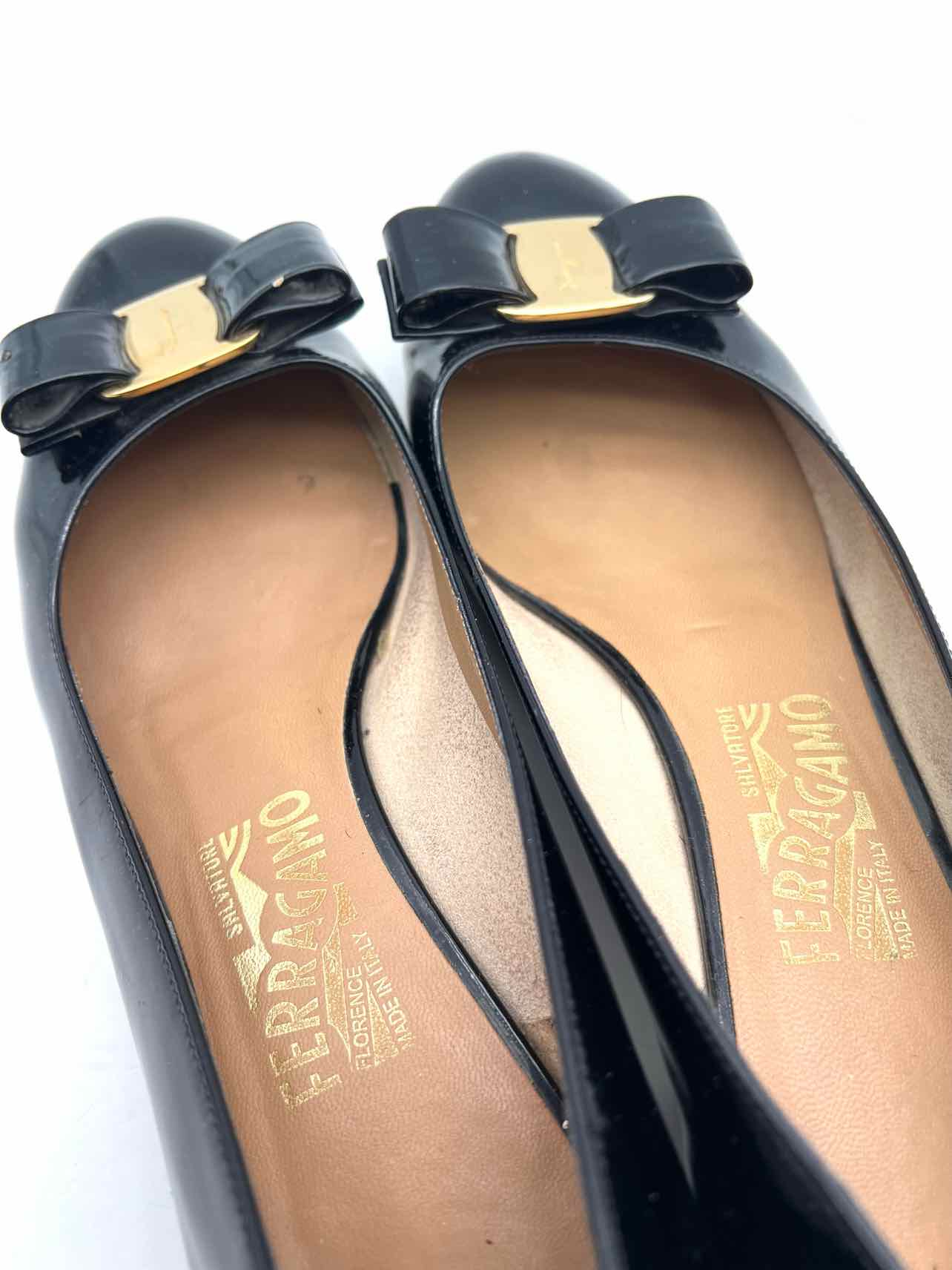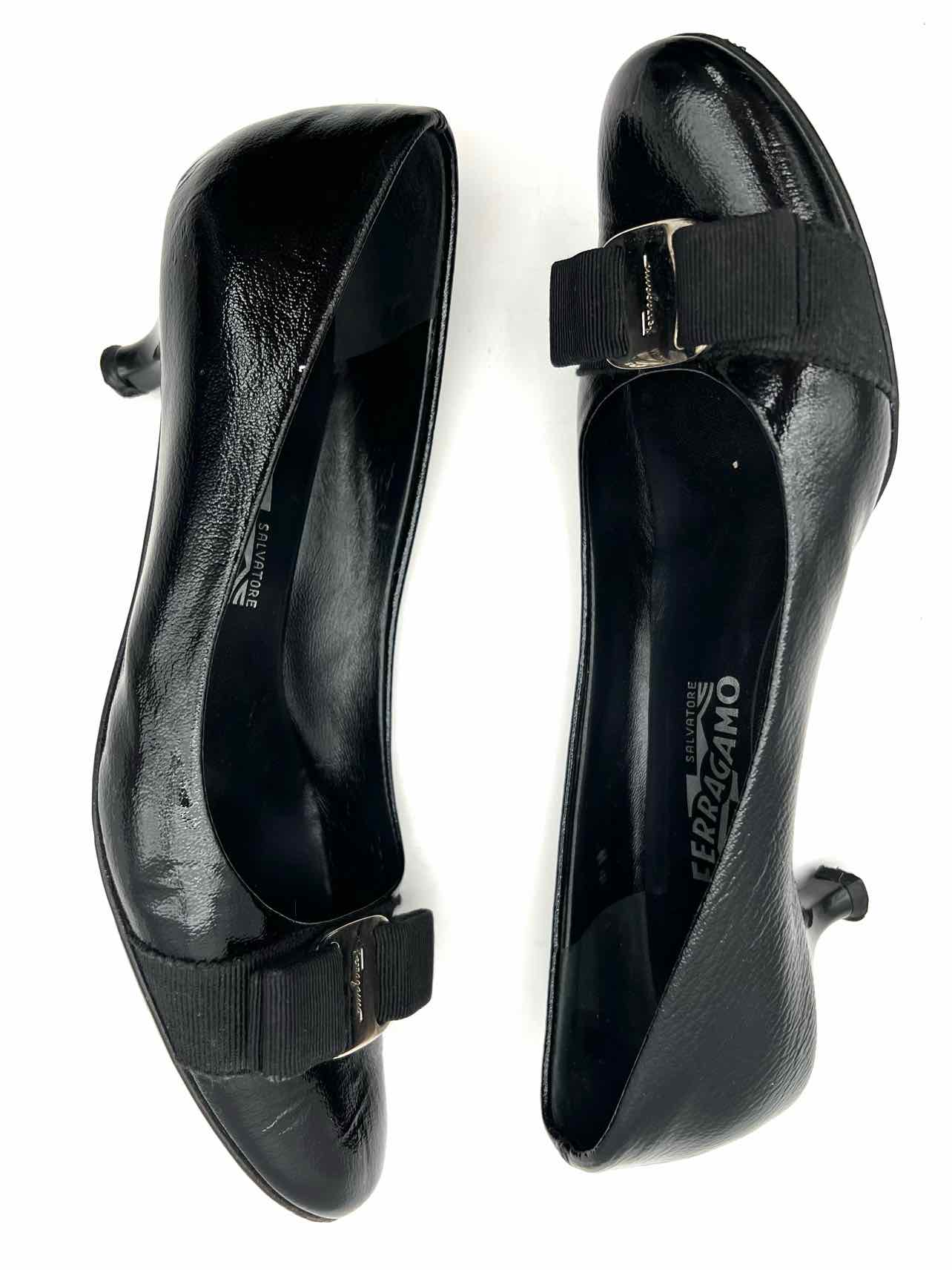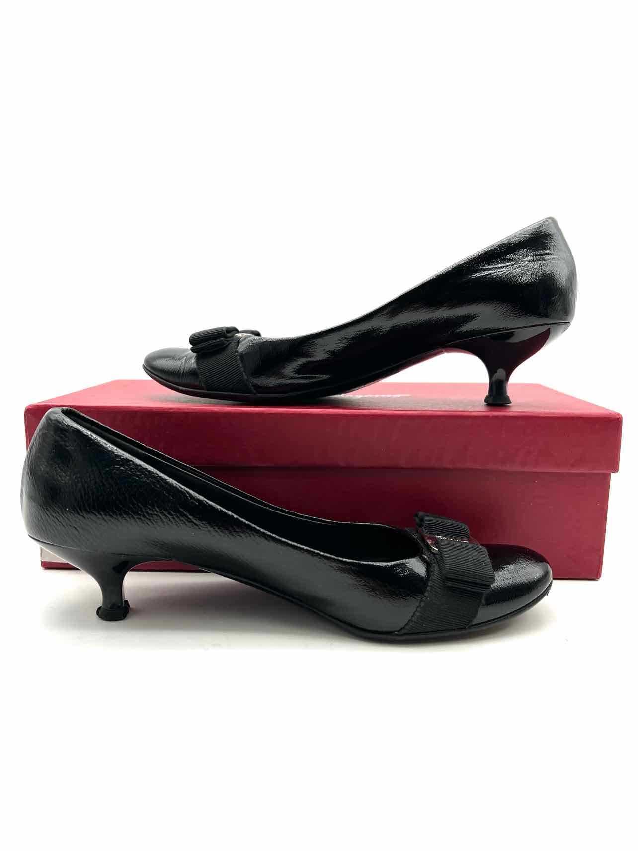 Salvatore Ferragamo Size 7.5 Black Bow(s) Patent Leather Shoes Heels